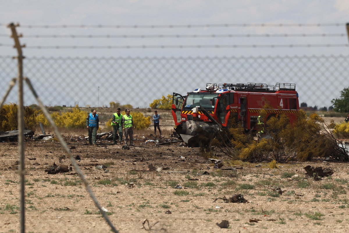 Restos del avión F-18 del Ejército del Aire que se ha estrellado esta mañana en la base aérea de Zaragoza, a 20 de Mayo de 2023, en Zaragoza, Aragón (España). - Fabián Simón - Europa Press