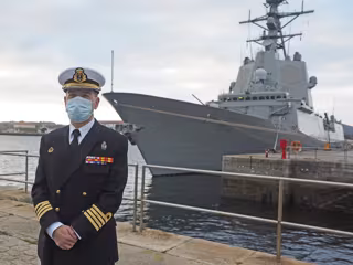 El comandante de la 31º Escuadrilla de Superficie, con base en el Arsenal Militar de Ferrol, y capitán de navío ‘Blas de Lezo’, Gonzalo Leira Neira, posa delante del buque horas antes de que zarpe, a 21 de enero de 2022 - José Díaz - Europa Press