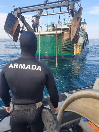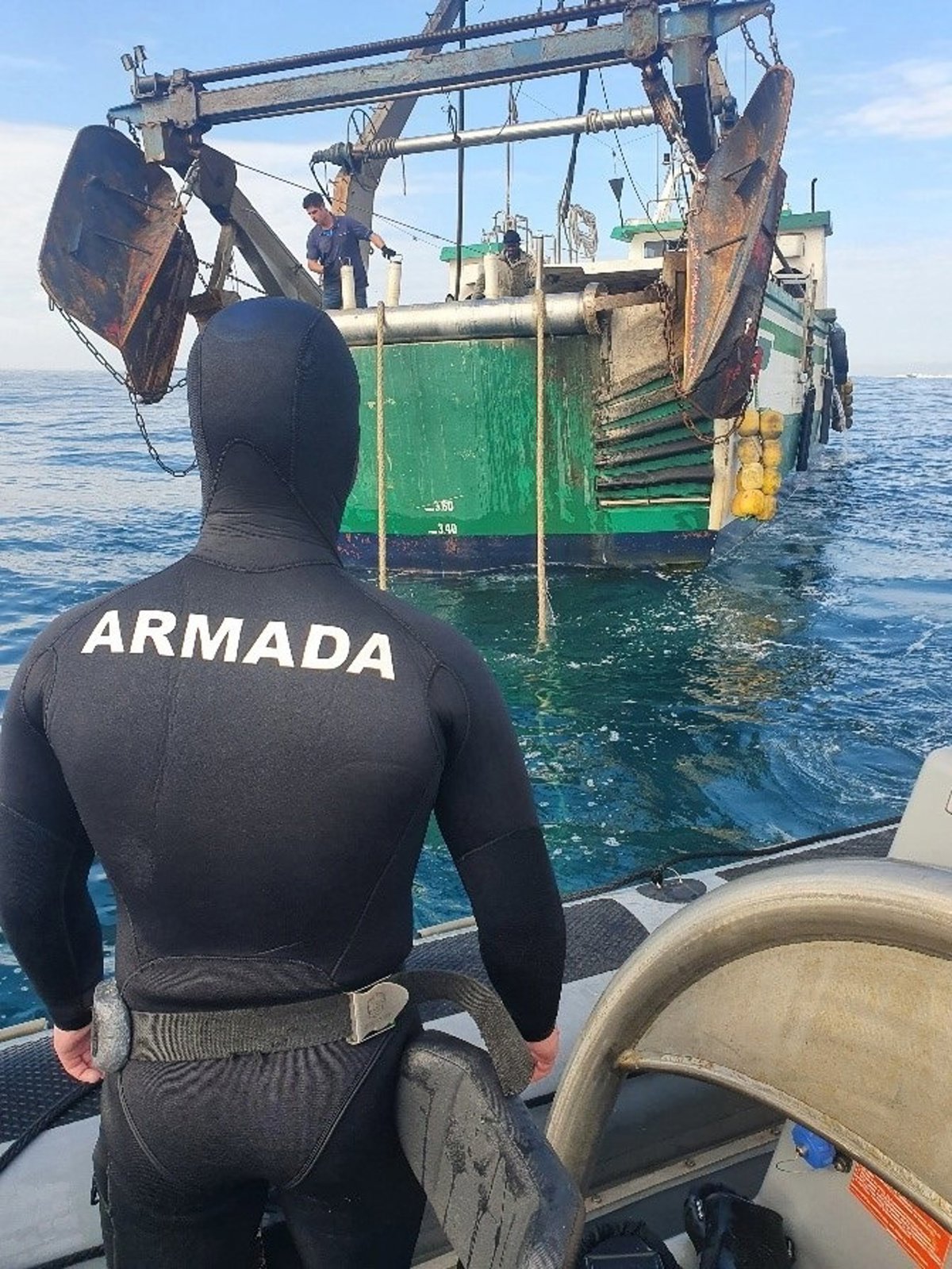 Mientras la inspectora de la Secretaría General de Pesca se encargó de verificar la documentación y la carga de a bordo de un pesquero próximo a la zona, tres buceadores del 'Tarifa' procedieron a auxiliar al pesquero.