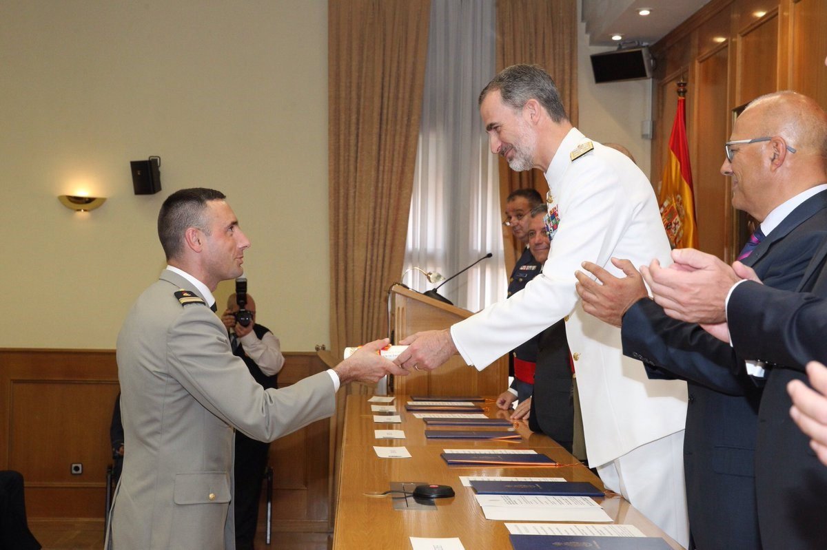Tras la entrega de los diplomas, el Rey ha concedido la Cruz del Mérito Naval con distintivo blanco y ha entregado el diploma del curso de Estado Mayor al número uno de la promoción, el capitán de corbeta de la Armada Jaime Salvador Muñoz Delgado-Pérez. Y ha entregado también el diploma al número uno de los alumnos extranjeros, el comandante francés Jean Francoise Varry.