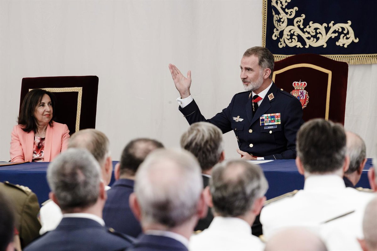 El Rey Felipe VI (c) y la ministra de Defensa, Margarita Robles (i) durante el acto de entrega de diplomas a los alumnos graduados en el XXIV Curso de Estado Mayor de la Escuela Superior de las Fuerzas Armadas, a 21 de junio de 2023, en Madrid (España) - Carlos Luján - Europa Press