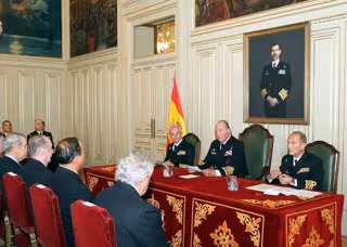 A su llegada al Cuartel General de la Armada, Don Juan Carlos ha sido recibido por el Almirante Jefe de Estado Mayor de la Armada, almirante general Teodoro López Calderón, por el director del Instituto de Historia y Cultura Naval, vicealmirante Fernando Zumalacárregui Luxán, y por el Almirante Jefe de Asistencia y Servicios Generales, contralmirante Gonzalo Sanz Alisedo.