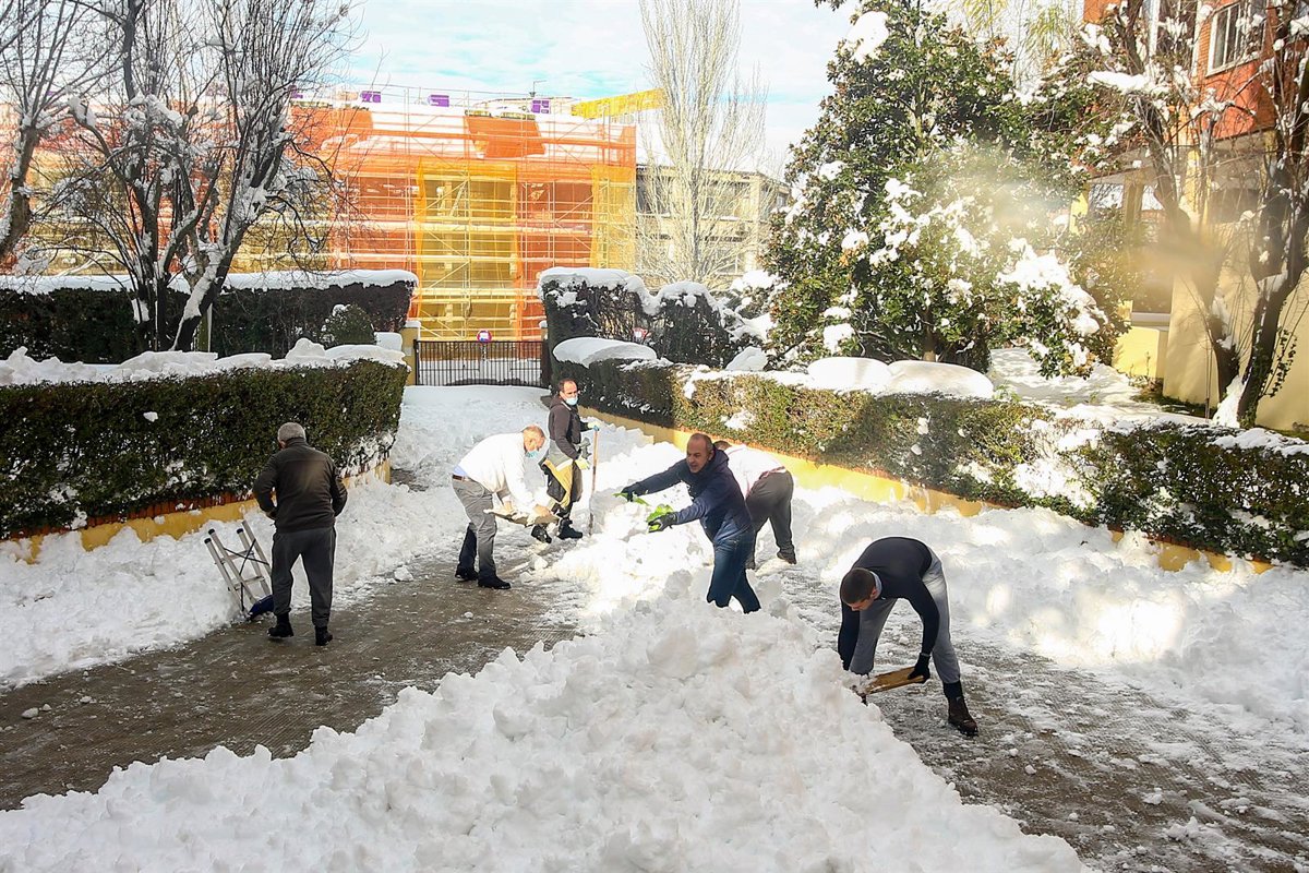Vecinos de la localidad de Pozuelo de Alarcón ayudan a retirar la nieve de las calles en Madrid (España) a 11 de enero de 2021. Madrid afronta hoy el primer día laborable en la región tras la gran nevada provocada por el paso de la borrasca Filomena. - Ricardo Rubio - Europa Press