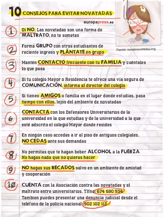 La infografía que encabeza esta noticia recoge un decálogo de consejos para evitar este tipo de prácticas. Entre ellos, negarse a hacer cosas en contra de lo que uno quiera, formar grupo con otros estudiantes de reciente ingreso, realizar otras actividades y plantarse en grupo.