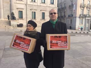 Enrique Mesa, profesor de Filosofía en el instituto madrileño El Espinillo ha entregado este miércoles 13 de diciembre en el Congreso de los Diputados 200.000 firmas, recogidas a través de la plataforma Change.org, para reclamar que esta asignatura se vuelva a estudiar en la ESO y en los dos cursos de Bachillerato, después de que la LOMCE la eliminara en la primera de estas dos etapas y dejara sólo en la segunda.