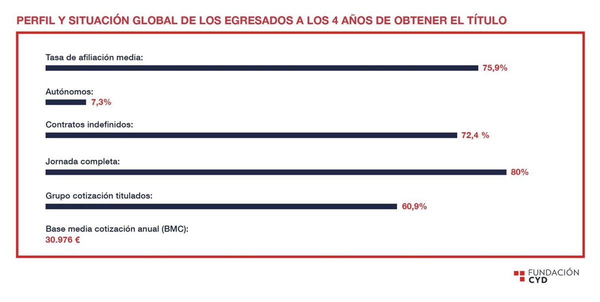 A los cuatro años de egresar, el 75,9% de los universitarios está afiliado a la Seguridad Social, un 72,4% tiene contrato indefinido y una base media de cotización salarial (BMC) de 30.976 euros.