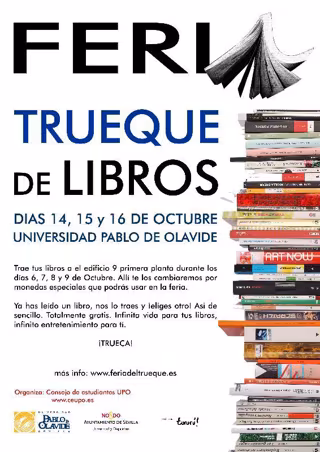 Los miembros de la comunidad universitaria de la Universidad Pablo de Olavide (UPO) y aquellos ciudadanos que quieran intercambiar libros ya leídos por otros por conocer podrán, a partir de mañana martes y hasta el viernes, cambiarlos por fichas que les servirán para adquirir otros libros la próxima semana en la I Feria del Trueque de Libros que ha organizado el Consejo de Estudiantes de la UPO (Ceupo).