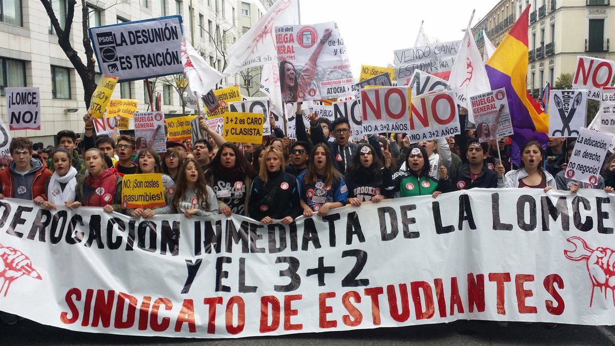 La manifestación convocada este jueves 14 de abril por el Sindicato de Estudiantes en Madrid para exigir la derogación "inmediata" de la Ley Orgánica para la Mejora de la Calidad Educativa (LOMCE), los recortes, el decreto '3+2', que permite a las universidades reducir la duración de los grados y aumentar la de los másteres, ha arrancado pasadas las 12.00 horas.