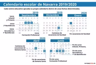 Las clases de los alumnos navarros del curso 2019-2020 comenzarán entre el 4 y el 6 de septiembre en el caso de Educación Infantil y Primaria y entre los días 5 y 6 de septiembre para los alumnos de Secundaria y 1º de Bachillerato. El Gobierno navarro establece estos intervalos en estos cursos y cada centro puede decidir cuándo comenzar el curso dentro de ellos. El primer día de clase de los alumnos de 2º de Bachillerato será el 5 de septiembre y aquellos que vayan a cursar Formación Profesional empezarán el 6 de septiembre.