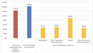 Esta cifra engloba los costes de la repetición en educación Primaria, ESO y Bachillerato (1.232,7 millones), el no aprovechamiento de recursos por fracaso escolar en ESO (1.426,2 millones) y por abandono temprano en Bachillerato (457,1 millones), Grado (899,4 millones), Grado Medio (492,6 millones) y Grado Superior (452,2 millones).