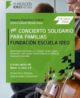 La Fundación Escuela Ideo , que tiene como objetivo principal la implicación en la realización de actividades artísticas y culturales para promocionar los valores de la cultura y el arte, ha organizado su primer concierto solidario para familias que tendrá lugar el próximo sábado 11 de marzo a las 12:00 horas, según informa la fundación.