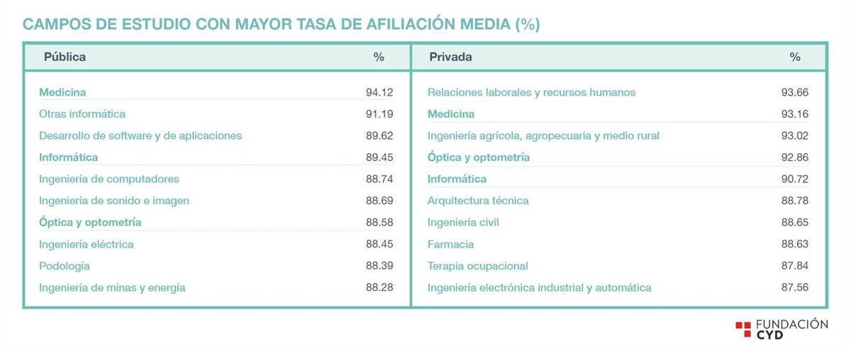 Si se analiza de forma global, teniendo en cuenta a las titulaciones que se imparten en ambos tipos de universidades, las que cuentan con mayor porcentaje de afiliación media son Medicina (94,12% en las universidades públicas y 93,16% en las privadas), Informática (89,45% en las públicas y 90,72% en las privadas), y Óptica y optometría (88,58% en las públicas y 92,86% en las privadas). Relaciones Laborales y recursos humanos (93,66%) destaca por su alto rendimiento en la universidad privada.