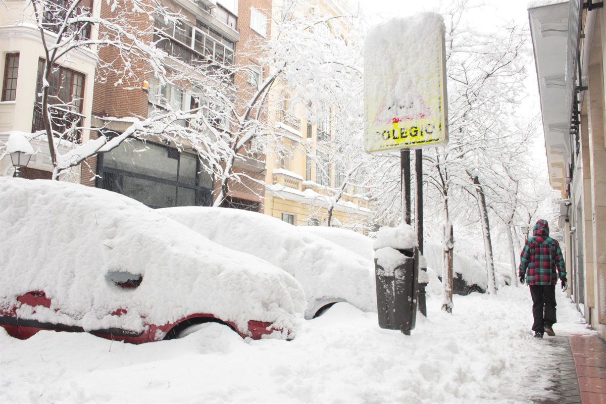 Una persona pasea por una céntrica calle cubierta de nieve junto al acceso de un colegio en Madrid - Tomás Parra - Europa Press