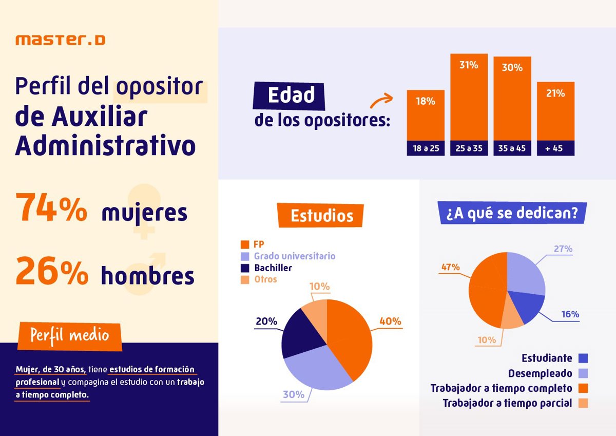 El perfil del opositor medio a auxiliar administrativo en España es una mujer de 30 años con un título de formación profesional, que compagina la preparación de la oposición con un trabajo a tiempo completo, según un estudio de MasterD, la academia especialista en preparación de oposiciones.