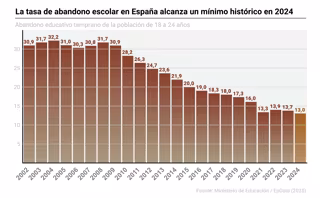 El abandono educativo temprano descendió el pasado año al 13%, es decir, 0,7 puntos menos que en 2023, marcando la tasa más baja de la historia. Desde 2018, este indicador ha descendido cinco puntos.