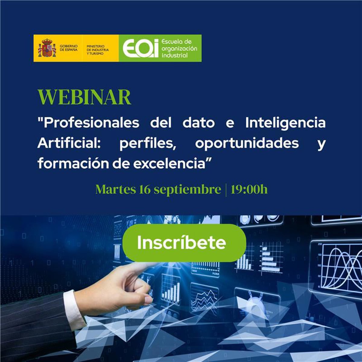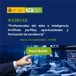 La Escuela de Organización Industrial (EOI) celebrará el próximo martes 16 de septiembre, de 19:00 a 20:00 horas, el webinar “Profesionales del dato e Inteligencia Artificial: perfiles, oportunidades y formación de excelencia”.