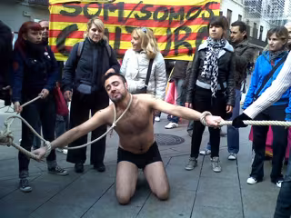 Un joven, vestido sólo con calzoncillos, ha sido quien ha interpretado el papel de toro, y varios animalistas le han arrastrado por el Portal de l'Àngel de Barcelona con una gruesas cuerdas que llevaba atadas en ambas manos.