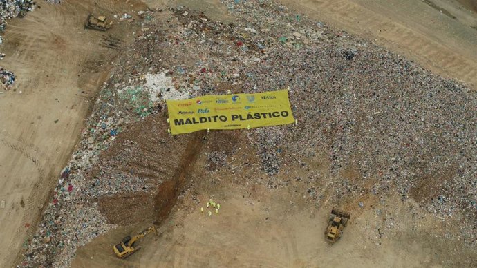 La organización ecologista han desplegado una pancarta gigante, de 30x12 metros, con el lema 'Maldito plástico', cuyo objetivo es denunciar que "las empresas productoras y distribuidoras de envases de plástico no se están responsabilizando de la recuperación y reciclaje de los mismos".