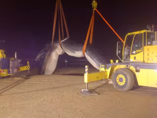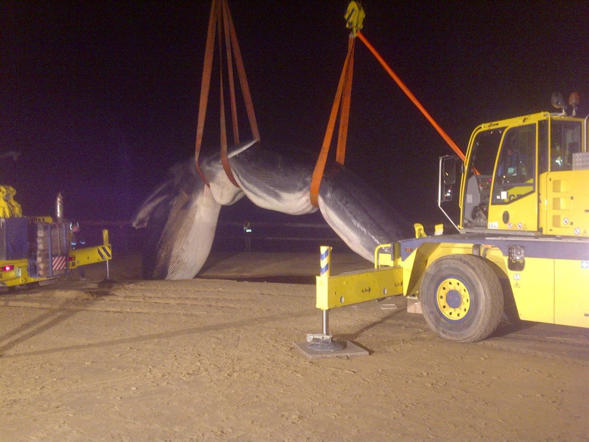 Tras activar el protocolo, el Ayuntamiento decidió llevar a cabo la operación mediante dos grúas de gran tonelaje, con las que se ha movido al cetáceo hasta un camión para que sea trasladado.