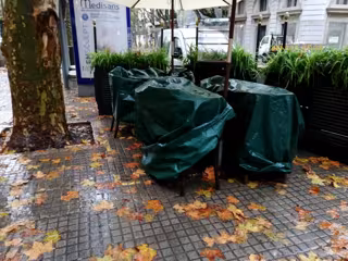Archivo - Mesas y sillas de terrazas cubiertas por una lona un día de lluvia en Palma. - EUROPA PRESS - Archivo