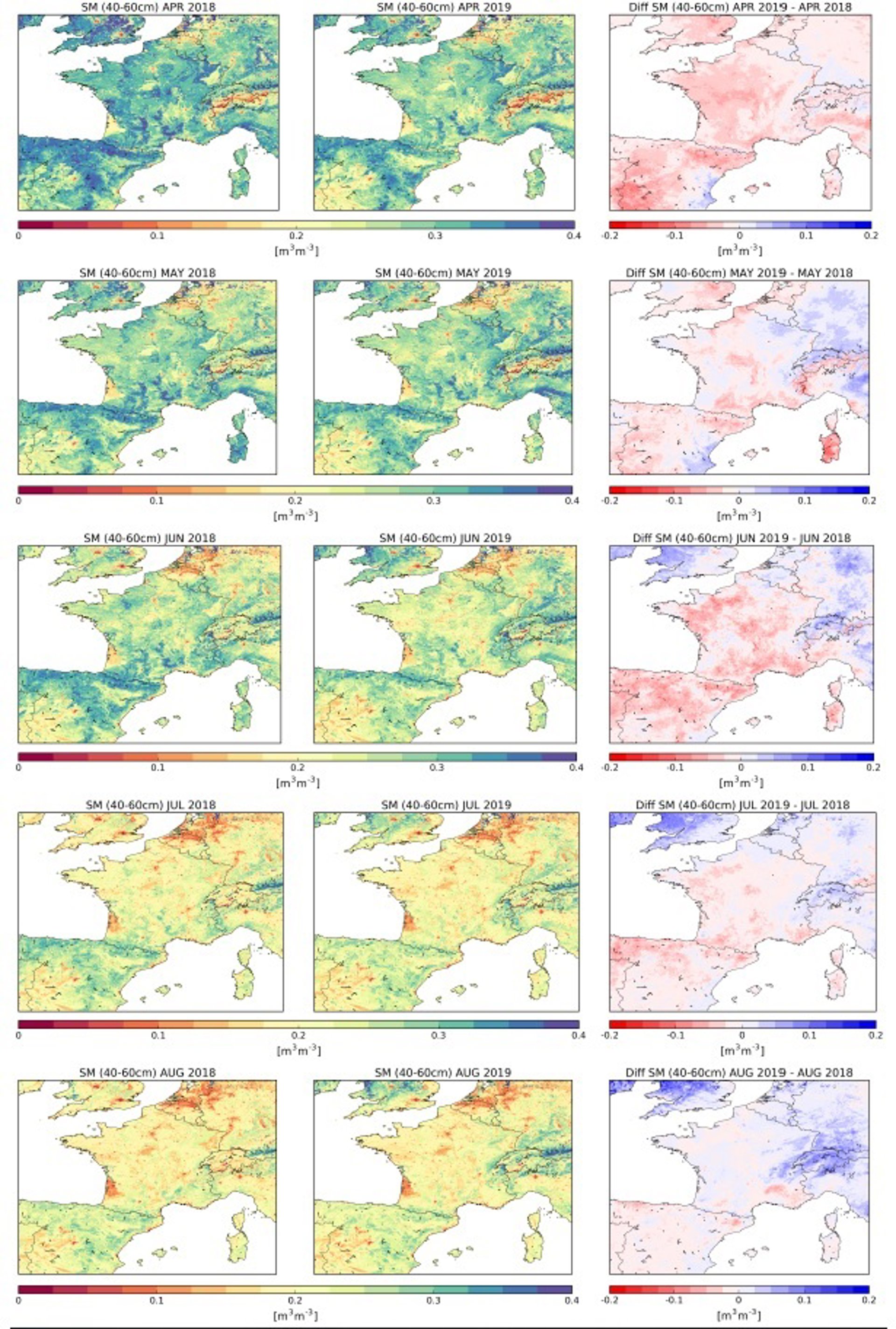 Los datos del programa de observación de la tierra indican que al coinicidir los bajos niveles de precipitación con los altos volumenes de evotranspiración la humedad del suelo fue "mucho más baja" de lo normal en el noroeste de Europa (Bélgica, Países Bajos y Sur de Inglaterra) durante el año 2018, así como en 2019 en zonas de Francia y España. Todo esto provocó un impacto en el crecimiento de la vegetación y el verdor.