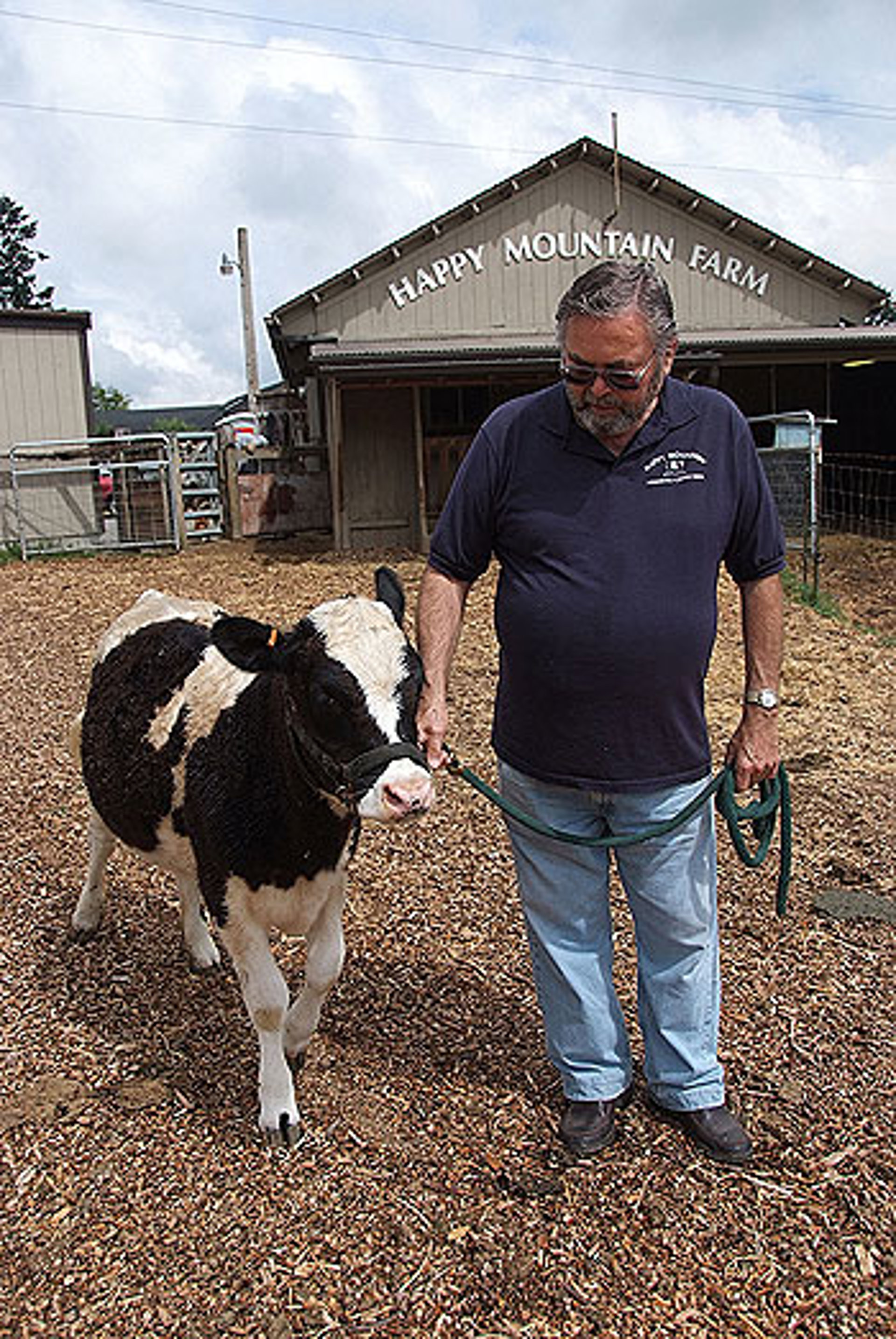 Gradwohl (en la imagen con uno de estos animales) desarrolló en su centro de investigación 16 de las 26 razas de 'mini vacas' que existen en todo el mundo, aunque su objetivo inicial fue cubrir las necesidades de siete mercados diferentes, entre los cuales, uno de los principales es el de las mascotas, según indica la BBC.