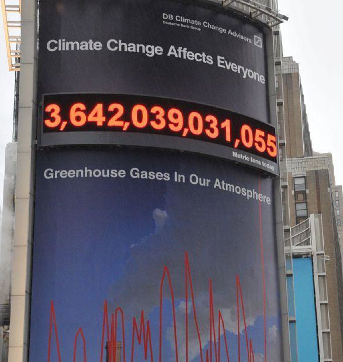Deutsche Bank Asset Management (DeAM) acaba de instalar en la ciudad de Nueva York el primer contador en tiempo real de emisiones de carbono a nivel mundial. Se trata de un cartel digital de 21 metros de alto, colocado frente al Madison Square Garden, que expone el número total de gases invernadero que se encuentran en la atmósfera.