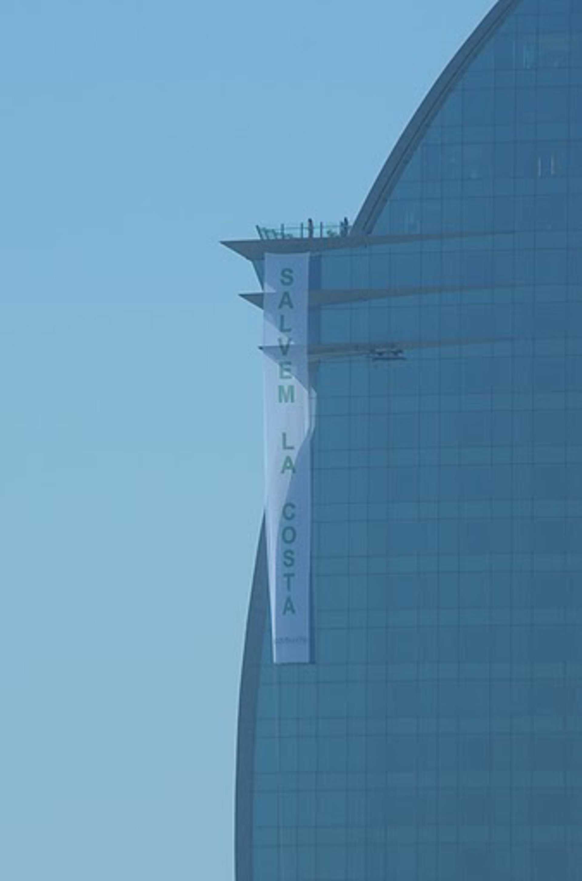 Los ecologistas han accedido a la explanada del recinto después de desembarcar desde su velero 'Diosa Maat' y han ascendido por las escaleras de emergencia del establecimiento hotelero, de cinco estrellas, para acceder a un balcón, desde donde han desplegado una pancarta de unos 25 metros con la inscripción 'Salvem la costa' (Salvemos la costa).
