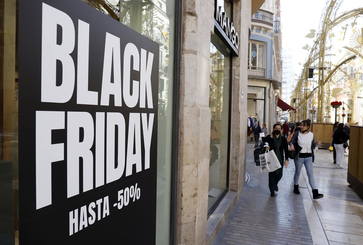 Comerciantes anuncian en sus escaparates los descuentos por comprar en la semana del Black Friday a 23 de noviembre del 2021. Málaga (Andalucía). Aunque el día oficial del Black Friday sea el próximo viernes 26 de noviembre, las ofertas empiezan días a - Álex Zea - Europa Press