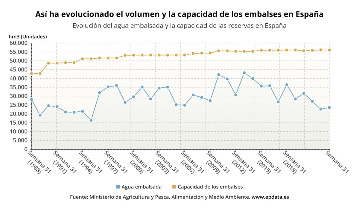 La reserva de agua embalsada ha caído esta semana hasta el 42,2 por ciento de su capacidad total, tras perder en siete días 692 hectómetros cúbicos, lo que representa un 1,2 por ciento, según datos del Ministerio para la Transición Ecológica y Reto Demográfico que informa de que en este momento los embalses guardan 23.637 hectómetros cúbicos.