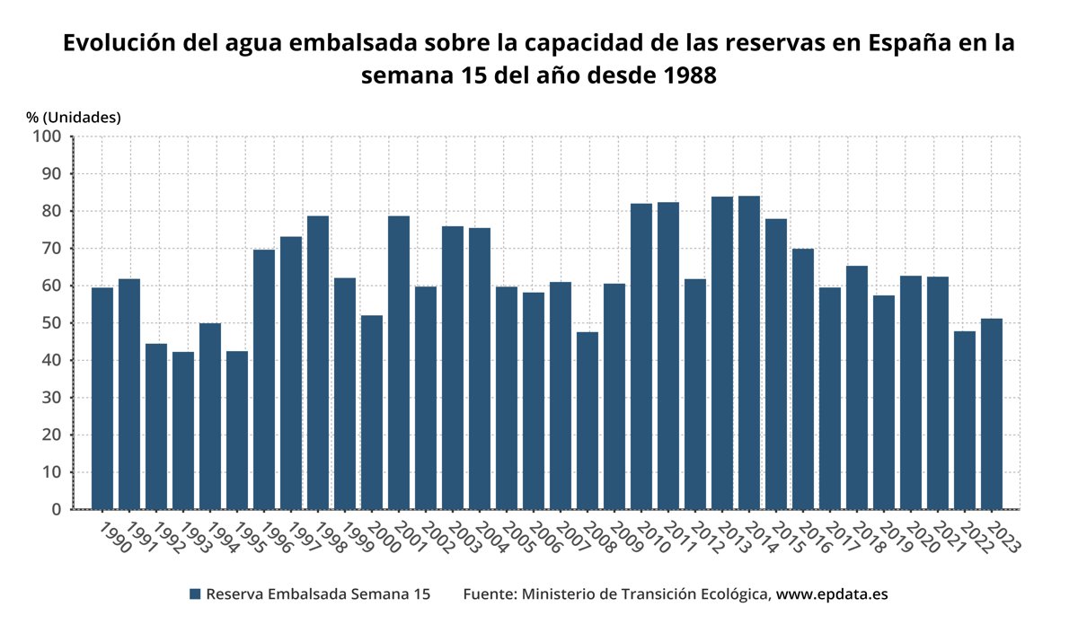 Excepto en 2022, cuando estaban al 47,80 por ciento de su capacidad total en la 15 semana del año, hay que remontarse 15 años, hasta 2008, para encontrar una cifra más baja que esta. Entonces, los embalses estaban al 47,58 por ciento de su capacidad total.