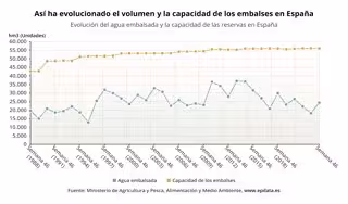En la actualidad, dadas las abundantes precipitaciones registradas en la vertiente Atlántica, aunque fueron escasas en la Mediterránea, los embalses guardan 21.414 hectómetros cúbicos.