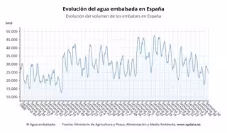 Esta semana, los embalses guardan 24.329 hectómetros cúbicos de agua, frente a los 23.521 hectómetros cúbicos de agua en comparación con el mismo periodo del año anterior aunque no llegan a los 33.675 hectómetros cúbicos de agua que suponen la media del decenio.