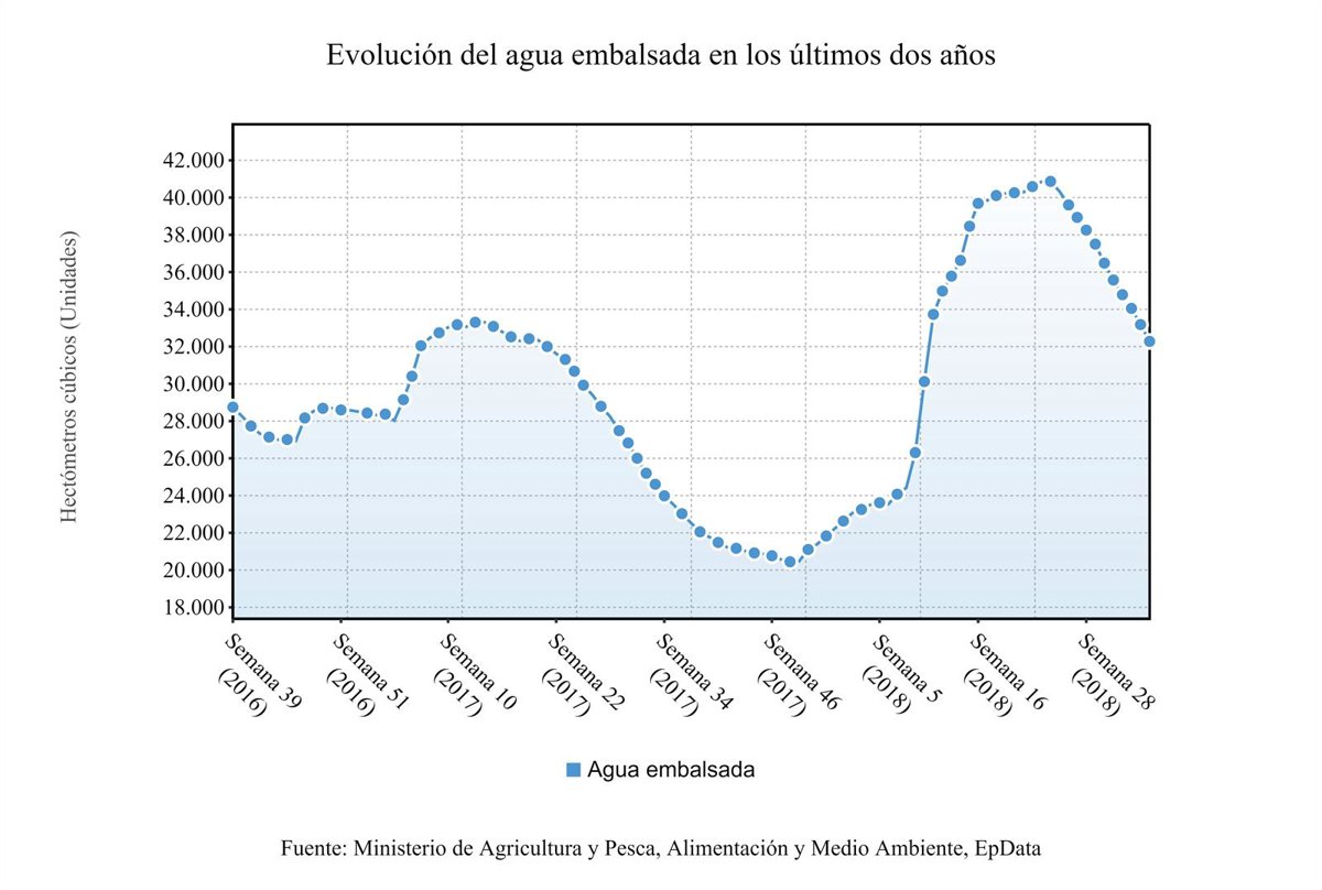 La reserva hidráulica se encuentra al 57,6 por ciento de su capacidad total esta semana, en la que ha decrecido en 901 hectómetros cúbicos, lo que representa el 1,6 por ciento de su capacidad total, según datos del Ministerio para la Transición Ecológica, que señala que en la actualidad aguardan 32.279 hectómetros cúbicos.