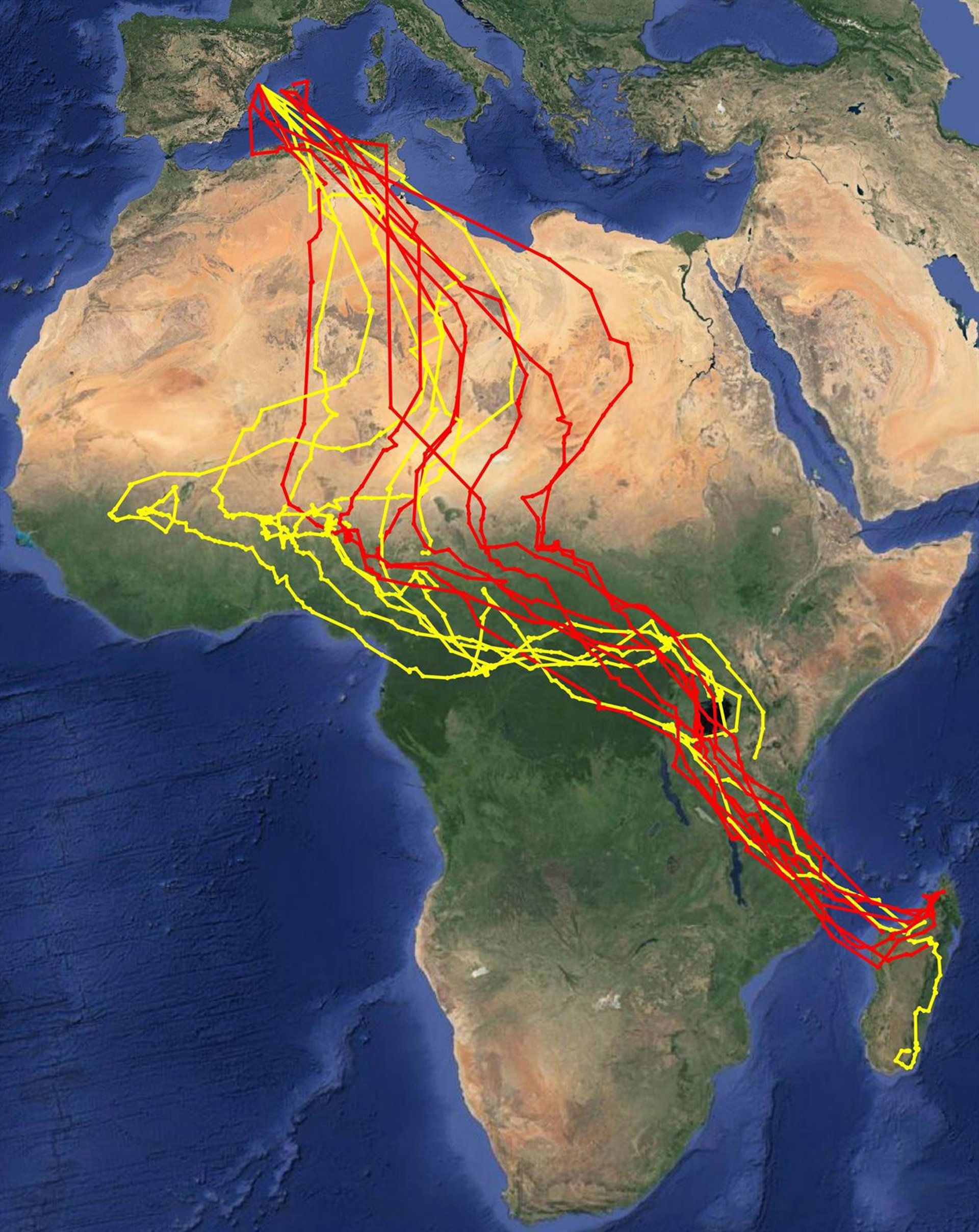 Se ha tenido que esperar a los primeros estudios con telemetría satelital realizados ya en el siglo XXI para confirmar esta hipótesis: los halcones de Eleonora se dirigen a Madagascar siguiendo la ruta más directa posible, atravesando África sin tratar de evitar ninguna barrera ecológica.