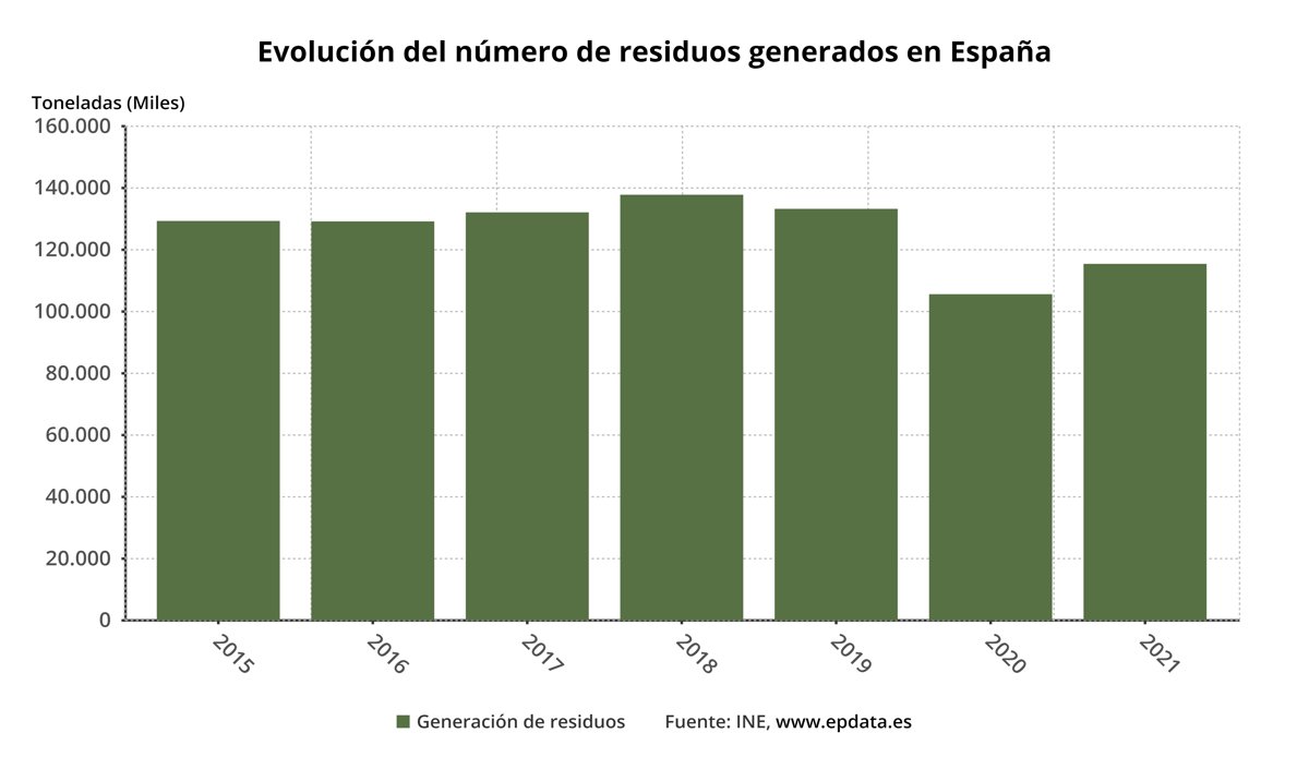 La economía española generó 115,4 millones de toneladas de residuos en 2021, lo que supone un 9,3 por ciento más que el año anterior, mientras que la tasa de reciclaje se elevó un 4,5 por ciento en ese año, hasta los 49,4 millones de toneladas de residuos recicladas, según las Cuentas ambientales del Instituto Nacional de Estadística (INE).