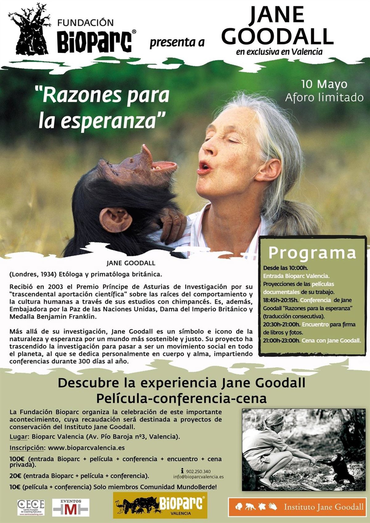 Será una jornada completa en la que la actividad principal será la conferencia 'Razones para la esperanza', impartida por Jane Goodall y que contará, además, con proyecciones de documentales sobre su trabajo, una exposición fotográfica y un encuentro y cena privada. Se trata de un acto benéfico cuya recaudación será destinada a proyectos de conservación del Instituto Jane Goodall.