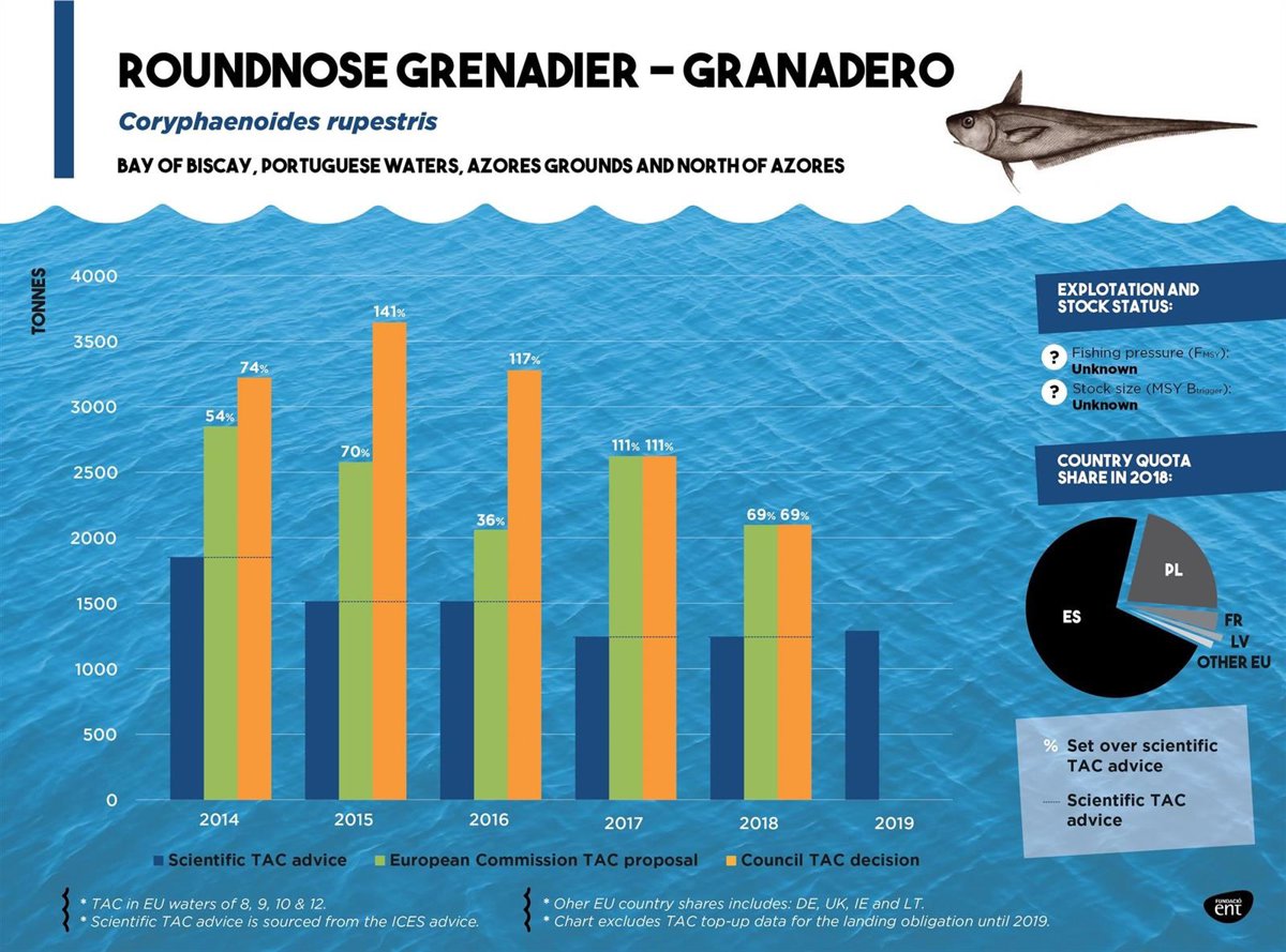 En el caso del besugo pinta, se aconseja cero capturas en el Mar Céltico, Canal de la Mancha y Golfo de Vizcaya. Pero año tras año la recomendación científica ha sido ignorada y los ministros europeos han terminado autorizando capturas más allá de los límites aconsejados.