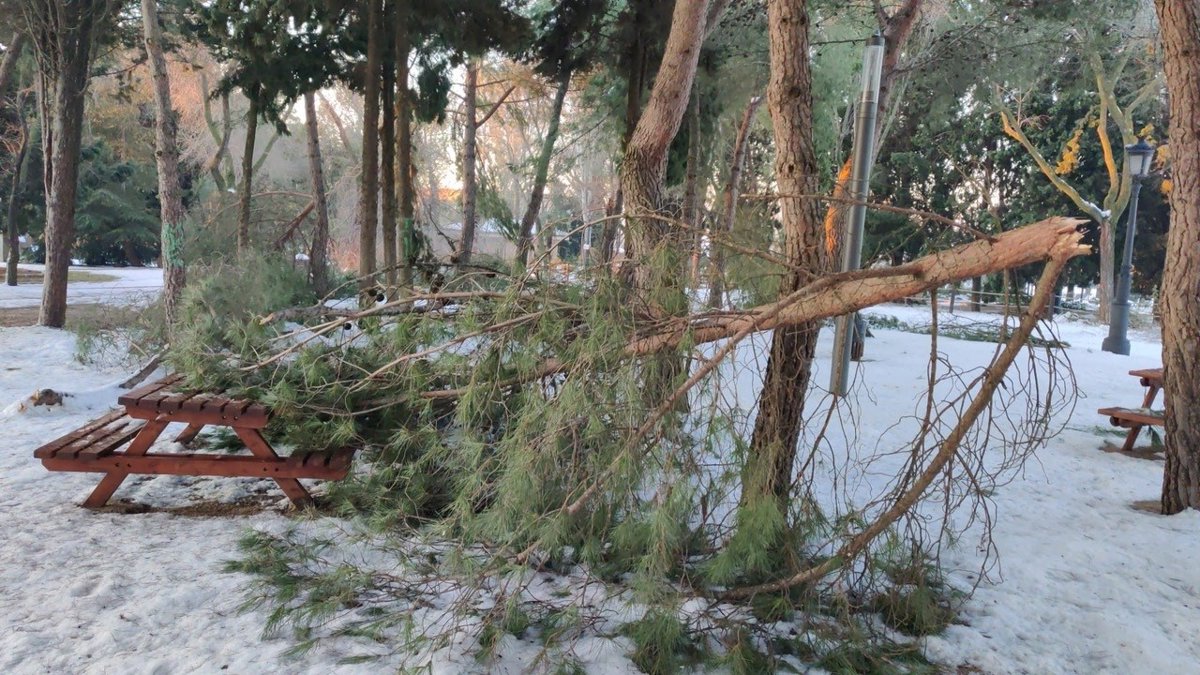 Las nevadas ocasionaron daños especialmente en zonas recreativas que se encuentran en las márgenes de la A-42, que conecta Madrid con Toledo, incluidas en el Catálogo de Montes de Utilidad Pública, y en la zona de Valdehierro en Madridejos.
