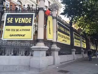Un grupo de activistas de Greenpeace ha cubierto completamente la verja de la fachada principal del edificio del Ministerio de Agricultura, Alimentación y Medio Ambiente (MAGRAMA) esta mañana con 200 metros cuadrados de carteles con el mensaje 'Se vende por cese de actividad' para denunciar el declive que han sufrido las políticas medioambientales en los últimos años y el incumplimiento de sus funciones por parte del Ministerio.