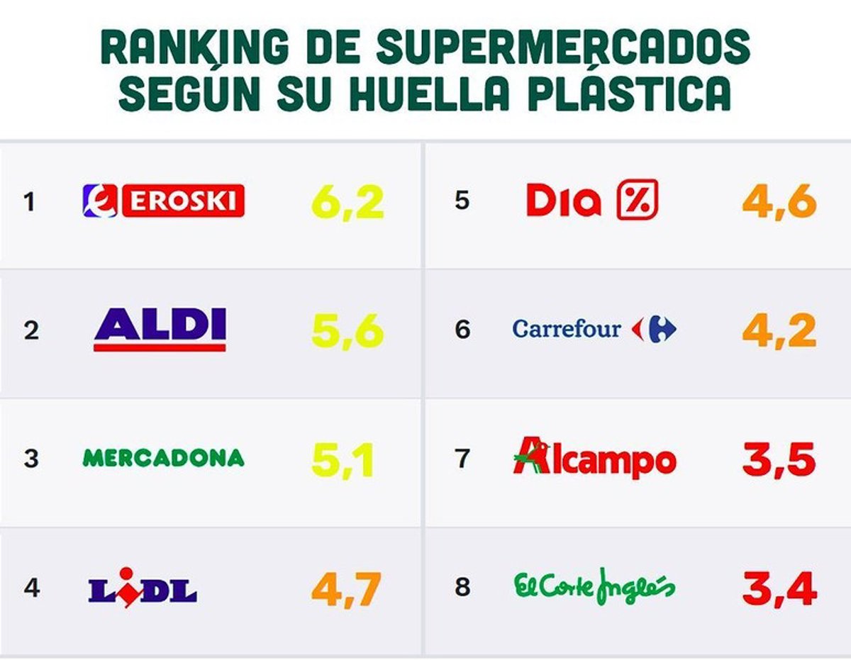 Así, la ONG ha elaborado un ranking en el que Eroski ha obtenido la mejor puntuación como la marca más comprometida contra el plástico, frente a El Corte Inglés, que es la que sale peor parada.