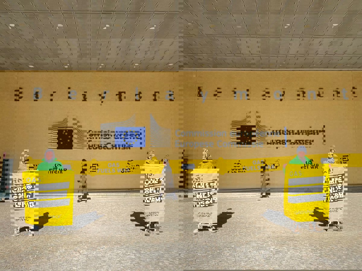 Greenpeace precinta la Comisión con la pegatina de una tubería para criticar el gasoducto entre Europa e Israel - RAQUEL ABAD