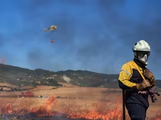 Un bombero y un helicóptero de la Brigada Helitransportada del Gobierno de Navarra realizan labores de extinción de un incendio forestal producido en una zona de campo de cereal, sin afectar a zonas urbanas, cerca de la localidad navarra de Sarriguren, - Eduardo Sanz / AFP7 / Europa Press