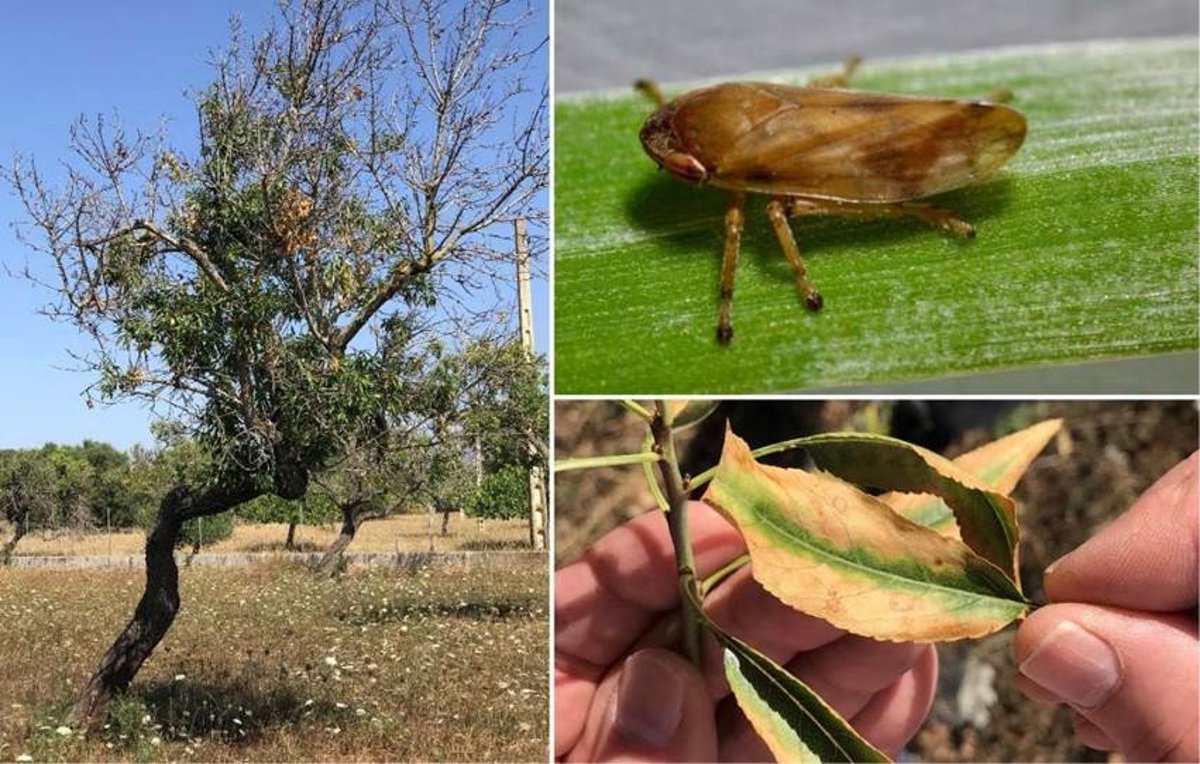 Árbol (izquierda) y hojas (abajo a la derecha) de almendro infectado por 'Xylella fastidiosa'. Arriba a la derecha, cigarrilla 'Neophilaenus campestris', uno de los vectores de transmisión de la bacteria - ALBERTO FERERES - Archivo