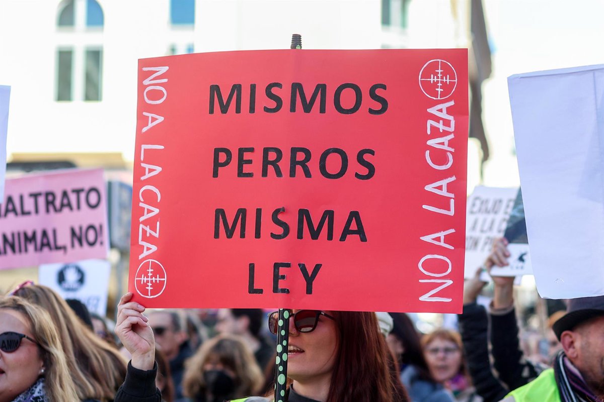 Una mujer sujeta una pancarta de 'Mismos perros misma ley' en una concentración bajo el lema No a la caza, en la Plaza de Callao, a 5 de febrero de 2023, en Madrid (España). Cada febrero, la Plataforma NAC (No a la Caza) convoca a nivel estatal una ma - Ricardo Rubio - Europa Press