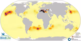 Mapa de solapamiento entre distribución de plásticos y de petreles y pardelas a nivel global, indicando las zonas de mayor riesgo, entre las que destaca el Mediterráneo - BIRDLIFE INTERNATIONAL