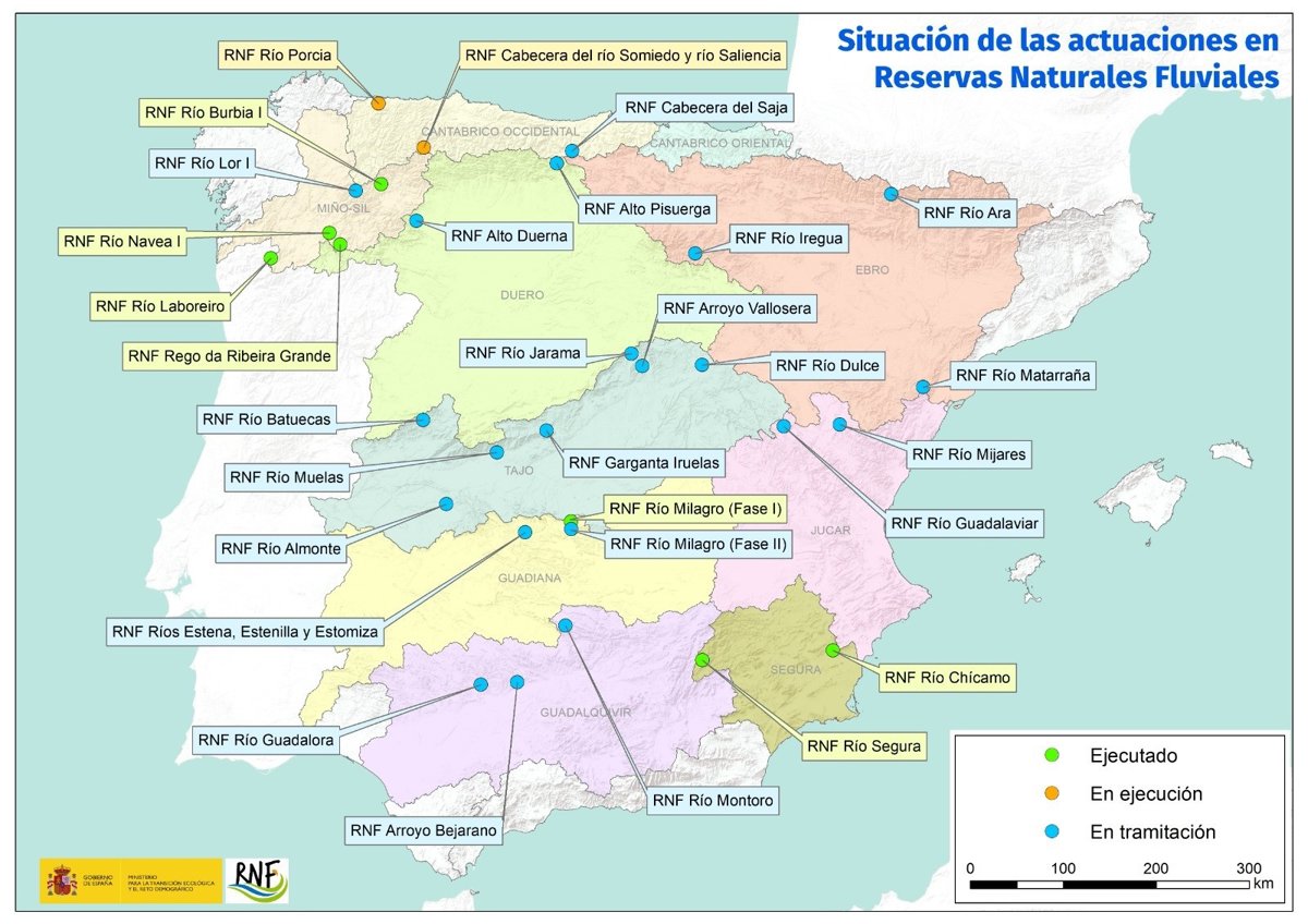 En el año 2020 se han restaurado cinco kilómetros de tramos de río en las cuencas del Miño-Sil y del Segura, donde además se han eliminado ocho barreras transversales obsoletas y se ha adaptado otras tres. Estas actuaciones, según el Ministerio han supuesto la recuperación de la continuidad longitudinal de 60 km de ríos en las reservas. En el caso de la cuenca del Cantábrico, se adjudicaron los trabajos en marzo de este año y está previsto que en estos días se inicien diversas actuaciones para la mejora de la continuidad fluvial en las reservas naturales fluviales de Somiedo y Porcia (Asturias).