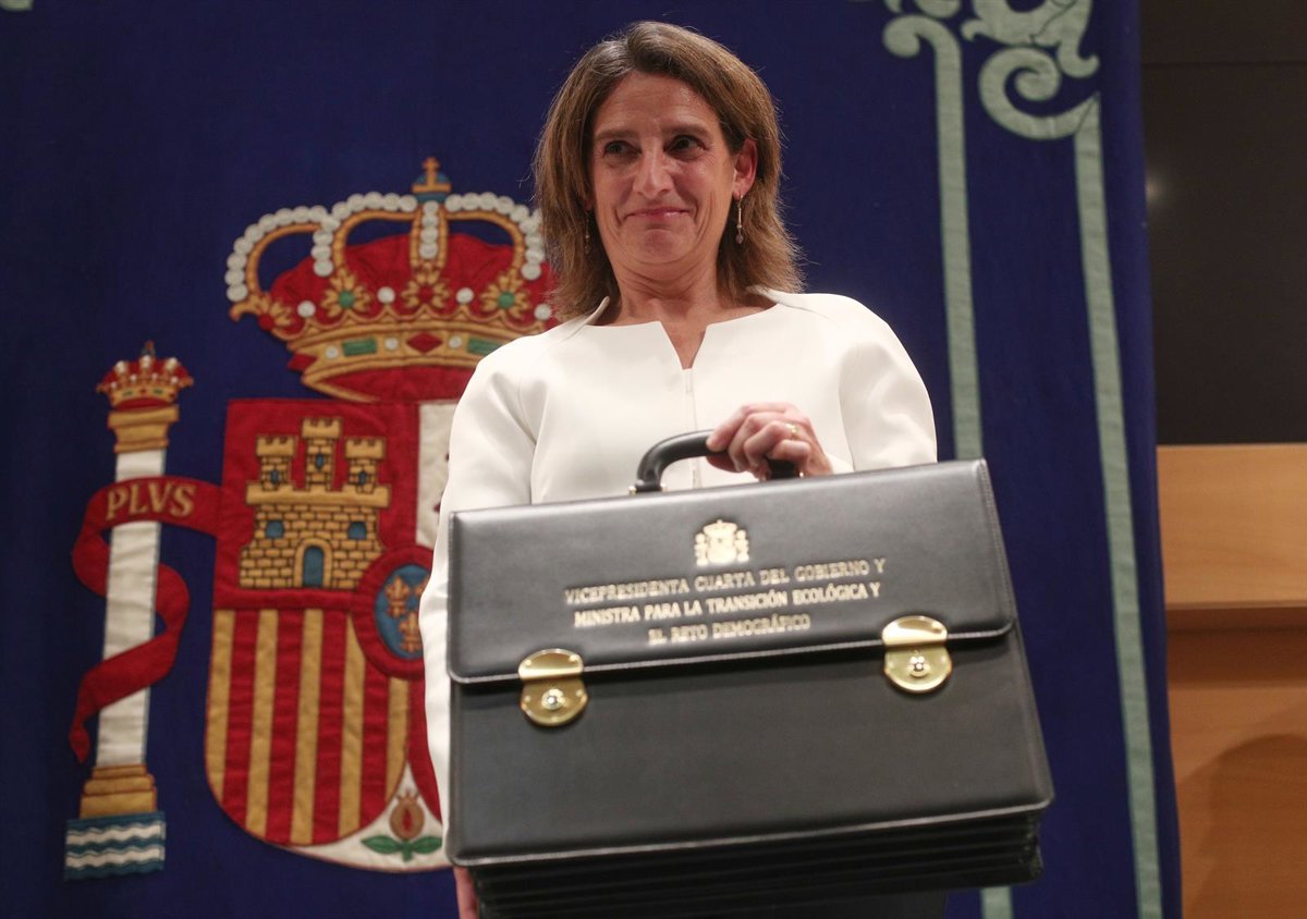 La nueva vicepresidenta de Transición Ecológica y Reto Democráfico,Teresa Ribera, posa con la cartera del Ministerio de Transición Ecológica durante el acto de toma de posesión de los ministros del Gobierno de coalición del PSOE y UP, 13 de enero de 2020 - Eduardo Parra - Europa Press