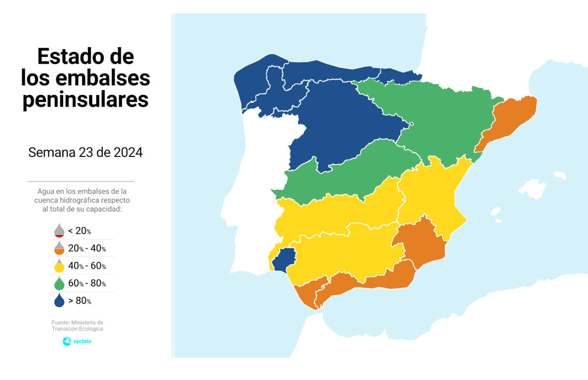 Los embalses almacenan actualmente 37.134 hectómetros cúbicos (hm3) de agua, disminuyendo en la última semana en 24 hectómetros cúbicos (el 0,0% de la capacidad total actual de los embalses). Y, por ámbitos, el Cantábrico Oriental se encuentra al 89%; el Cantábrico Occidental, al 94,9%; el Miño-Sil, al 90,2%; Galicia Costa, al 84,9%; las cuencas internas del País Vasco, al 95,2%; el Duero, al 91,9%; el Tajo, al 79,3%; el Guadiana, al 50,2%; el Tinto, Odiel y Piedras, al 85,2%; Segura al 23; Cuenca Mediterránea Andaluza al 31,6% Guadalete-Barbate al 29,6%; el Júcar, al 54,4%; y el Ebro, al 76,6%.