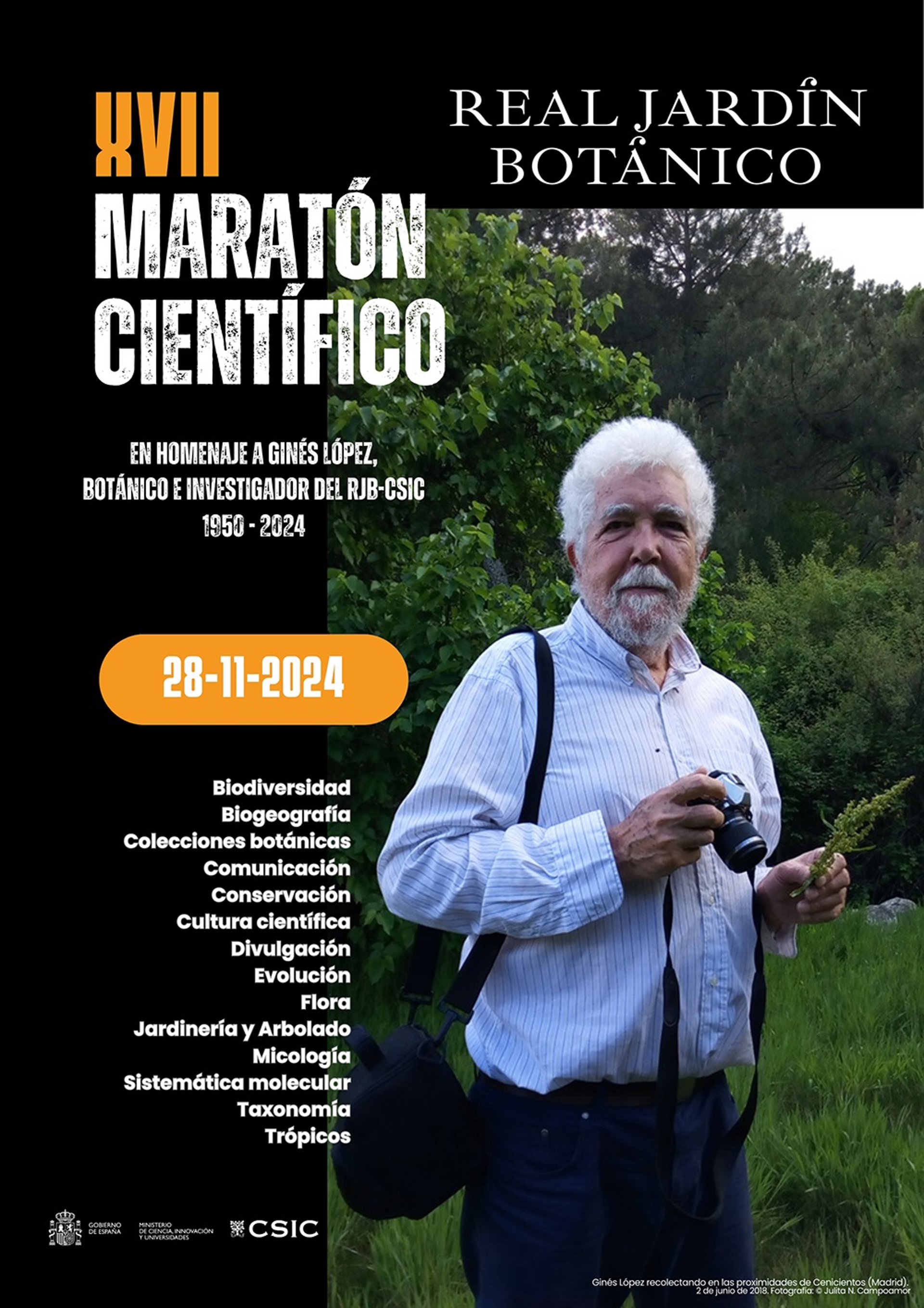 La XVII edición del Maratón científico RJB-CSIC está dedicada a la figura del investigador y botánico Ginés López, investigador y botánico durante más de tres décadas en el Resal Jardín Botánico-CSIC, fallecido repentinamente el pasado 23 de junio. Amigos, familiares y la comunidad científica le rindieron un homenaje el pasado 16 de octubre.